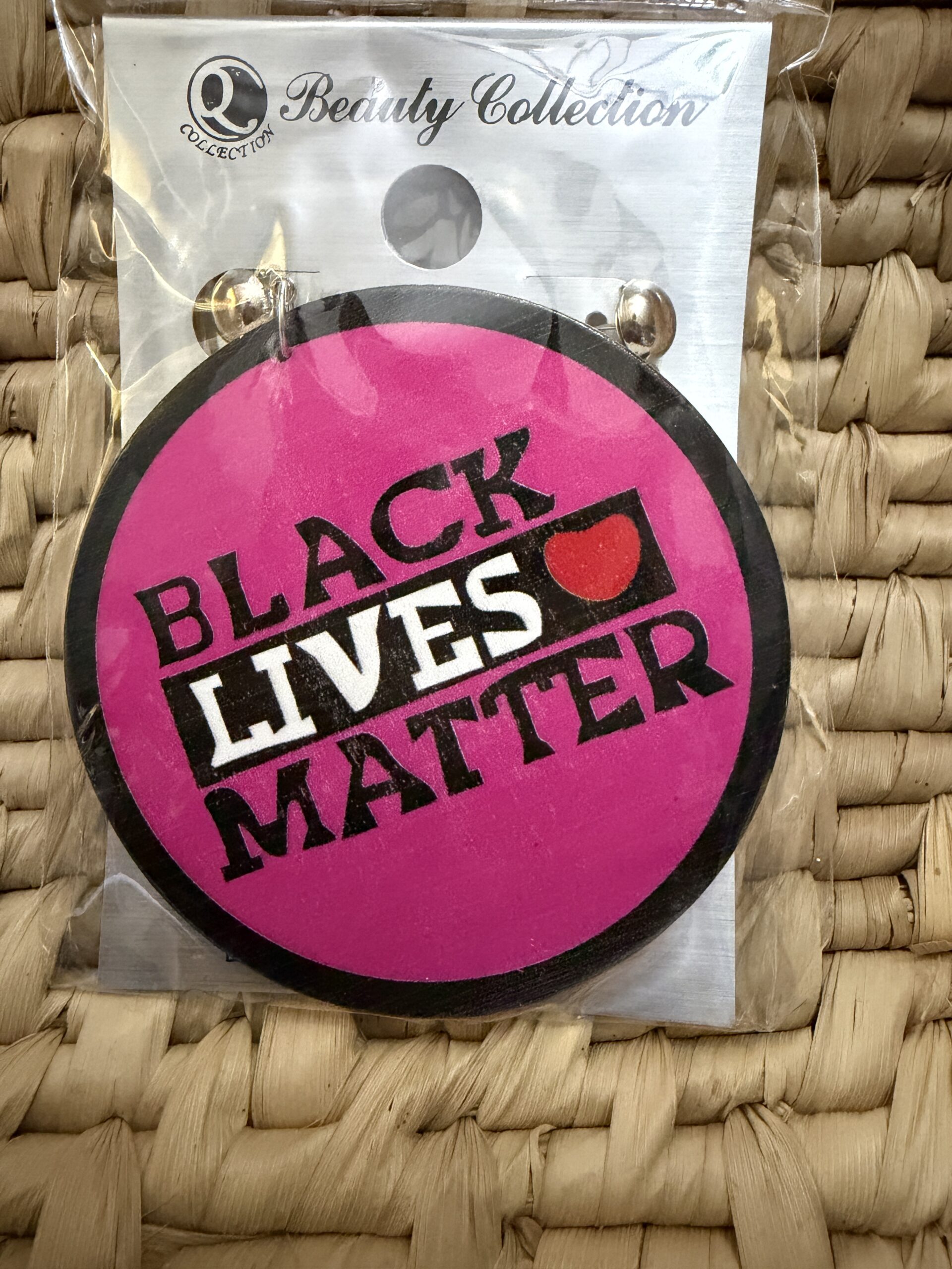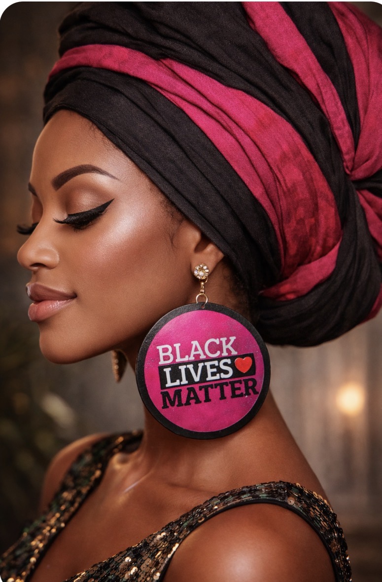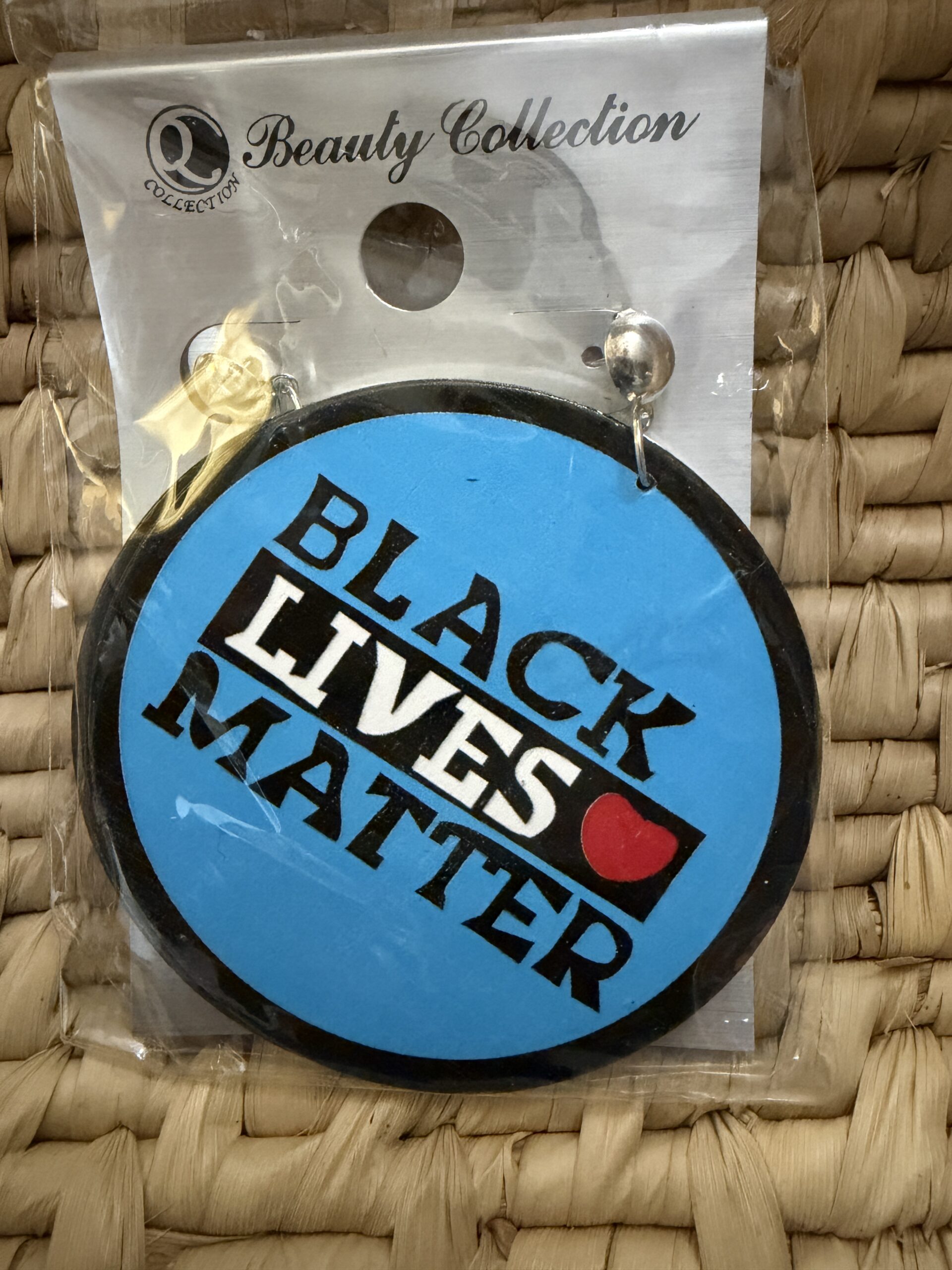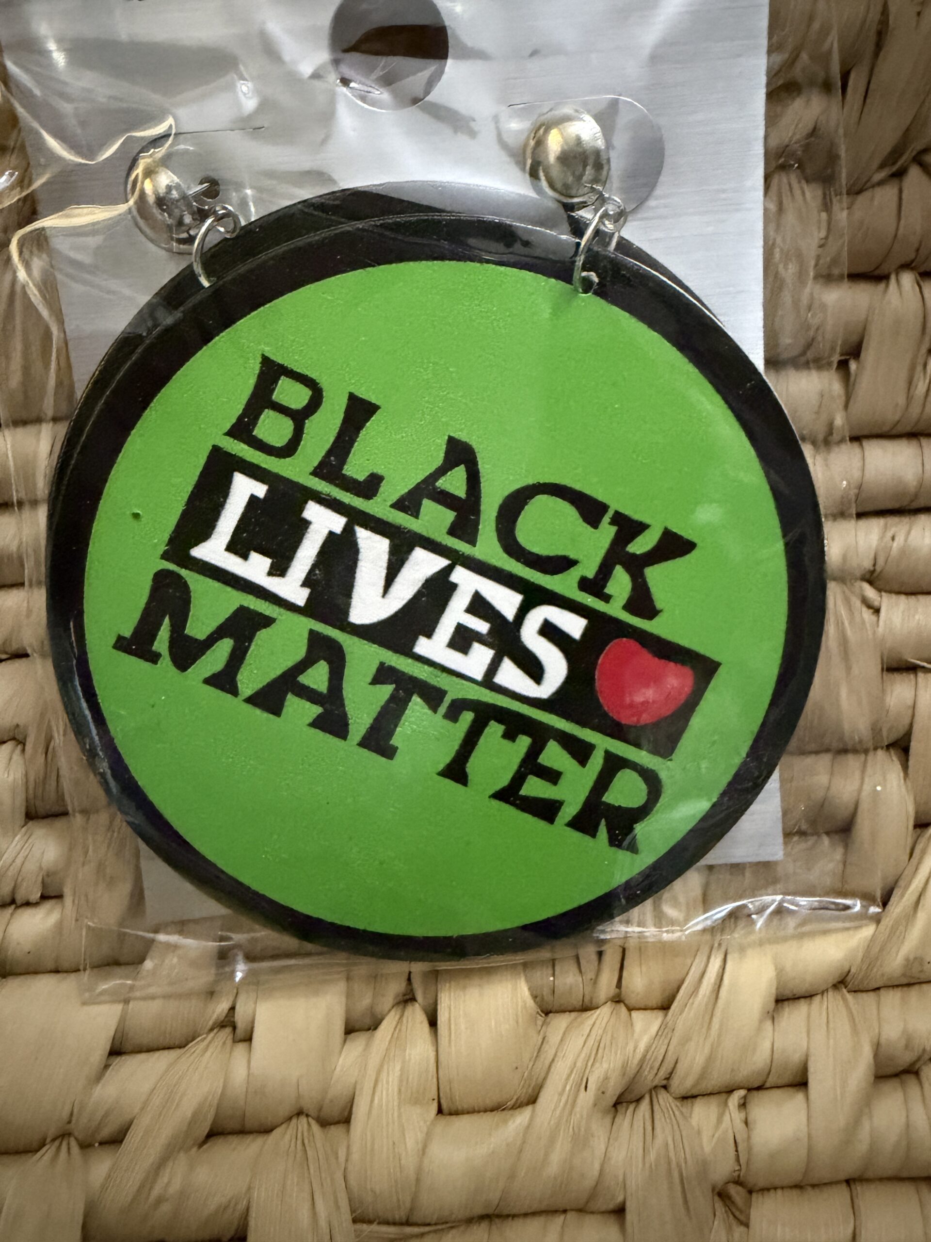 Make a bold statement with these round “Black Lives Matter” dangle earrings featuring a heart accent and high-contrast lettering on a vibrant colored background. Available in green, pink, and blue, each pair comes carded and bagged, ready for gifting or resale; lightweight design is comfortable for all-day wear and perfect for rallies, community events, or everyday solidarity style.