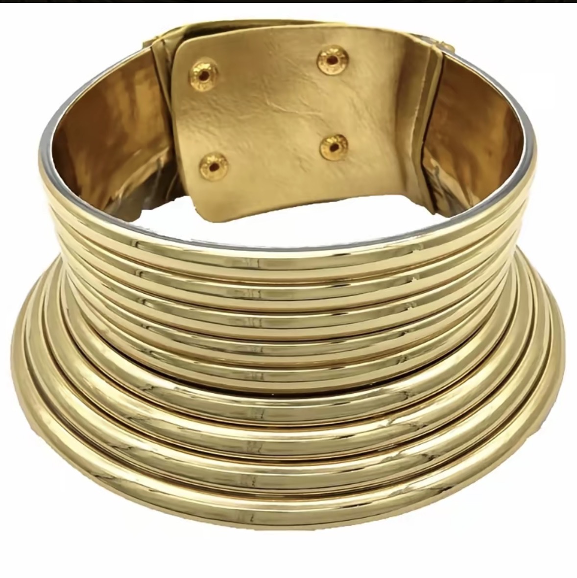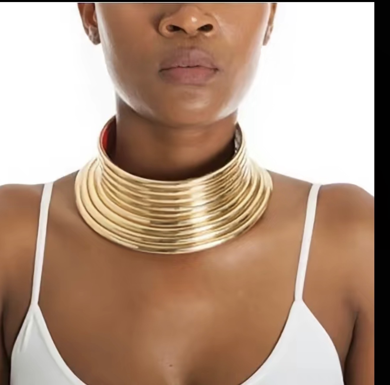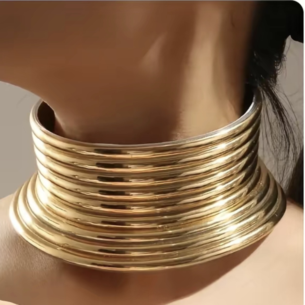 Turn heads with this stunning gold statement choker necklace, designed to elevate any outfit with bold elegance. Featuring a multi-layer stacked design, this piece sits beautifully around the neck, creating a powerful, luxurious look.
