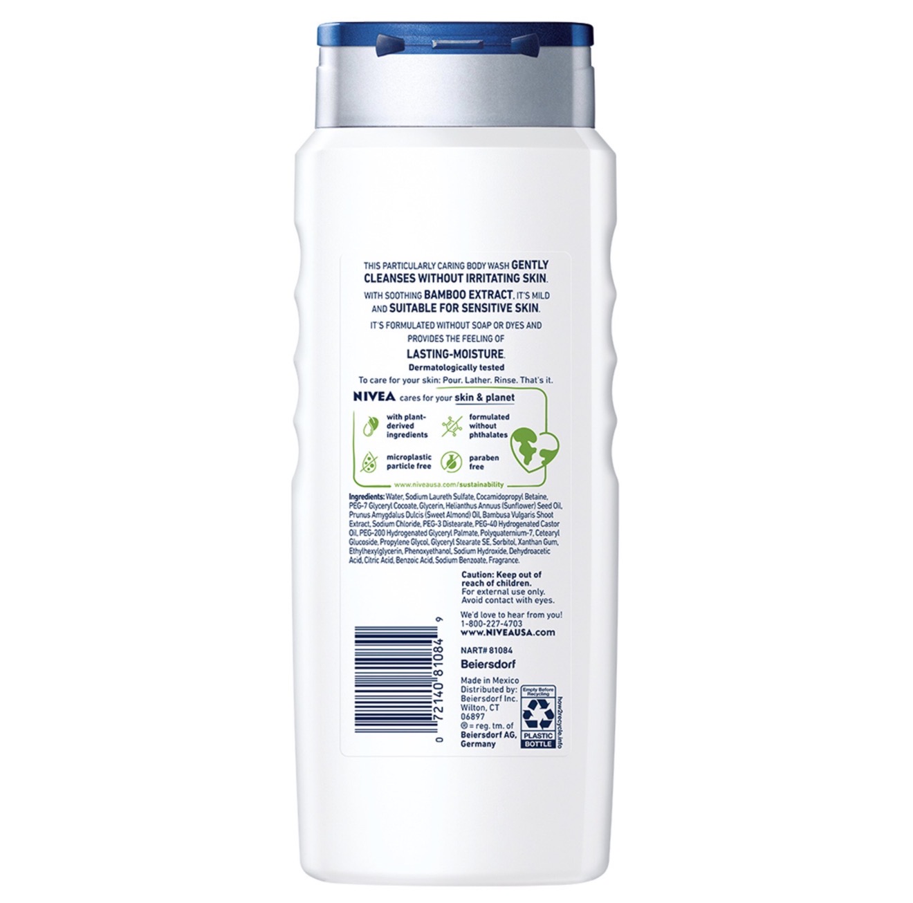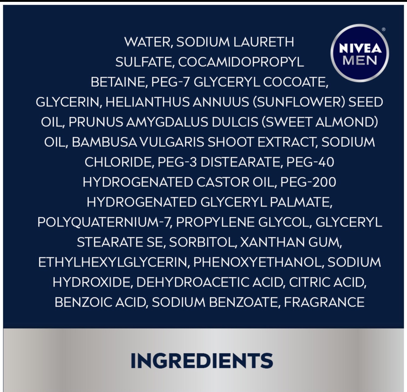 NIVEA MEN Sensitive Body Wash with Bamboo Extract is specifically developed for men with easily irritated or sensitive skin. This caring 3‑in‑1 formula works as a body wash, face wash, and shampoo, gently removing dirt and sweat while providing nourishing moisture so skin feels hydrated and comfortable after every shower. Enriched with soothing bamboo extract and almond oil, the soap‑free, pH‑balanced wash helps calm skin instead of stripping it, making it ideal for daily use. It features a light citrus scent for a refreshing, not overpowering, shower experience and is made with 92% naturally derived ingredients, free from parabens, phthalates, dyes, and microplastic particles. For best results, apply to wet skin, lather over body, face, and hair, then rinse thoroughly.